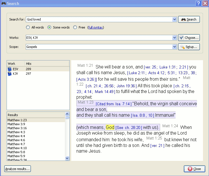 You can narrow the scope of your search to certain parts of the Bible by selecting one of the predefined scopes from the list in Search scope. You can define your own search ranges by clicking the Setup ranges button.